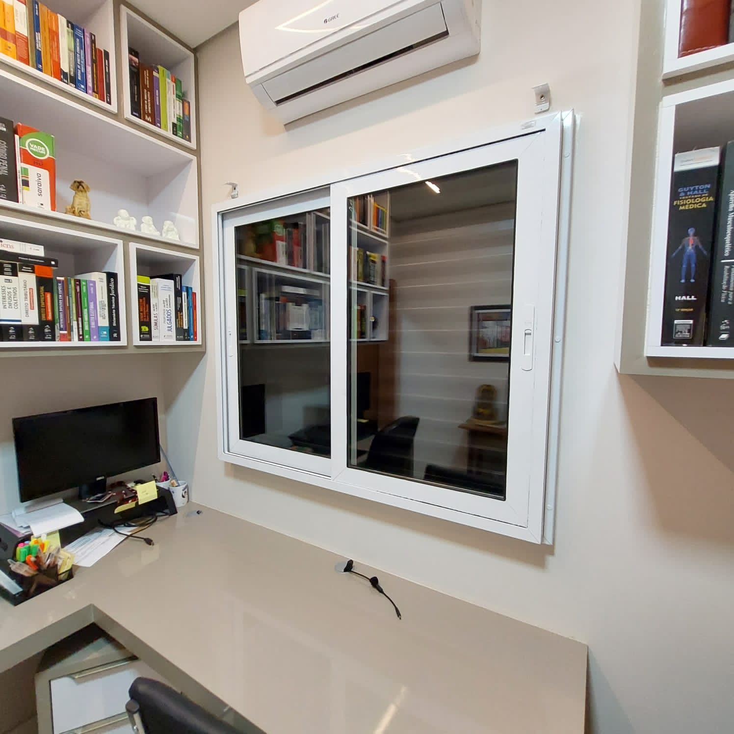O projeto recebeu um acabamento de alto padrão com perfis na cor branca em pintura eletrostática, o que proporcionou um visual discreto e elegante que se harmoniza com a decoração interna. Além disso, a escolha da espessura dos vidros foi feita de acordo com a demanda de isolamento acústico específica de cada ambiente, demonstrando a personalização e precisão técnica da Conforto Acústica.